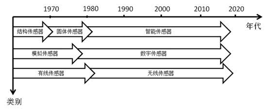 在20世紀(jì)90年代,無線傳感器網(wǎng)絡(luò)技術(shù)逐漸成熟。傳感器技術(shù)發(fā)展歷程如下圖所示。