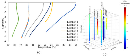 無人機04 00035 g006 550 圖6. 按位置和水深分布的水溫分布:(a)2D散點圖和(b)3D散點圖。