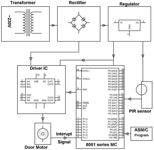 如果門附近有人體運(yùn)動(dòng),則人體發(fā)出的紅外輻射將使傳感器產(chǎn)生感應(yīng)信號(hào),該信號(hào)被饋送到微控制器。然后,微控制器通過(guò)驅(qū)動(dòng)器IC控制和操作門電機(jī)。因此,如果有人靠近門,則微控制器將發(fā)送一個(gè)命令以打開門,并設(shè)置一個(gè)延時(shí)時(shí)間以自動(dòng)關(guān)閉門。該項(xiàng)目旨在用于購(gòu)物商場(chǎng),劇院和酒店的門。