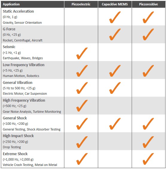 下表總結(jié)了如何為您的應(yīng)用選擇合適的加速度計(jì)。