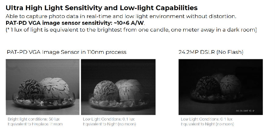 一個(gè)例子是SeeDevice的技術(shù),稱(chēng)為PAT-PD(光子輔助隧穿照片檢測(cè)器),該技術(shù)實(shí)際上是消除了傳感器所說(shuō)的“光子泄漏”,該公司稱(chēng)這種技術(shù)將可見(jiàn)光和近紅外照片功能結(jié)合在一起。聲稱(chēng)的好處包括在減少運(yùn)動(dòng)失真,低光捕獲和動(dòng)態(tài)范圍等領(lǐng)域超越了當(dāng)今的傳感器。該公司已經(jīng)在其網(wǎng)站上發(fā)布了幾張比較圖像,其中包括一張?jiān)跇O低光靜止圖像下勝過(guò)DSLR的圖像。
