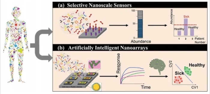 基于納米材料的復合傳感器陣列的基本工作原理。圖片由ACS Nano提供