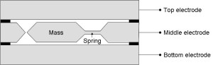 加速度傳感器的核心器件是電容式體硅微機(jī)械傳感器。COLIBRYS制造加速度傳感器的關(guān)鍵技術(shù)在于三層硅晶片結(jié)構(gòu)。