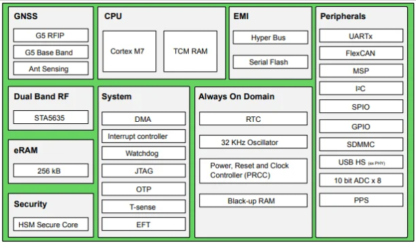 除了三頻性能外,新芯片還可以執(zhí)行其他定位技術(shù),例如標(biāo)準(zhǔn)多頻位置速度時(shí)間 (PVT) 和航位推算。根據(jù)數(shù)據(jù)表,STA8135GA 圍繞單個(gè) Arm Cortex M7 內(nèi)核構(gòu)建,以 314 MHz 的最大時(shí)鐘頻率運(yùn)行。該內(nèi)核由 16 KB 的 I-cache、16 KB 的 D-cache 和 256 KB 的系統(tǒng) RAM 支持。