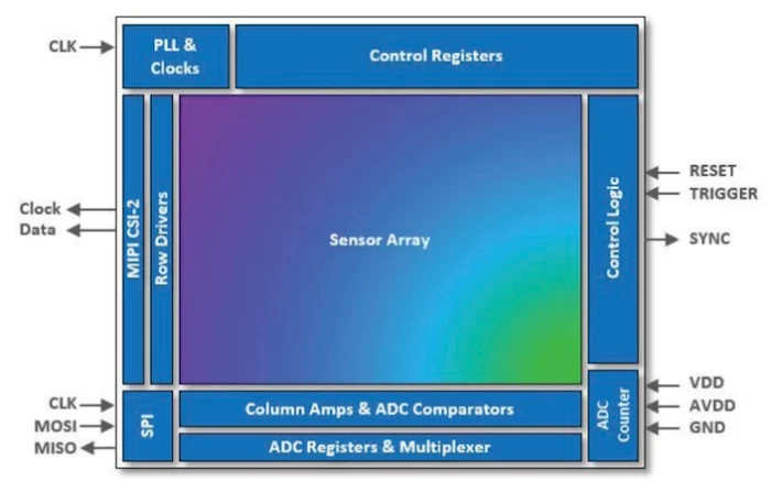 該接口包含一個 4 通道MIPI CSI-2輸出接口,以 1.5 Gbps/通道運行,以及一個 SPI 40 MHz 控制接口。Hawkeye 在 120 fps 下使用低于 750 mW,工作溫度范圍為 -40 ℃ 至 +85 ℃(否則稱為工業(yè)應(yīng)用)。