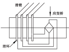 將專用的測扭應變片用應變膠粘貼在被測彈性軸上,并組成應變橋,若向應變橋提供工作電源即可測試該彈性軸受扭的電信號。這就是基本的扭矩傳感器模式。 (見圖二)但是在旋轉(zhuǎn)動力傳遞系統(tǒng)中,最棘手的問題是旋轉(zhuǎn)體上的應變橋的橋壓輸入及檢測到的應變信號輸出如何可靠地在旋轉(zhuǎn)部分與靜止部分之間傳遞,通常的做法是用導電滑環(huán)來完成。