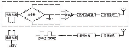 將專用的測扭應變片用應變膠粘貼在被測彈性軸上并組成應變橋 ,向應變橋提供電源即可測得該彈性軸受扭的電信號。將該應變信號放大后,經(jīng)過壓/頻轉(zhuǎn)換,變成與扭應變成正比的頻率信號。本系統(tǒng)的能源輸入及信號輸出是由兩組帶間隙的特殊環(huán)型變壓器承擔的,因此實現(xiàn)了無接觸的能源及信號傳遞功能。(虛線內(nèi)為旋轉(zhuǎn)部分)