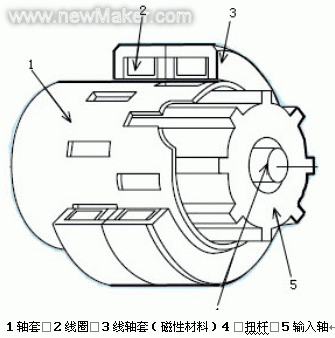 如圖4所示為非接觸式扭矩傳感器的典型結(jié)構(gòu)。輸入軸和輸出軸由扭桿連接起來(lái),輸入軸上有花鍵,輸出軸上有鍵槽。當(dāng)扭桿受方向盤(pán)的轉(zhuǎn)動(dòng)力矩作用發(fā)生扭轉(zhuǎn)時(shí),輸入軸上的花鍵和輸出軸上鍵槽之間的相對(duì)位置就被改變了。花鍵和鍵槽的相對(duì)位移改變量等于扭轉(zhuǎn)桿的扭轉(zhuǎn)量,使得花鍵上的磁感強(qiáng)度改變,磁感強(qiáng)度的變化,通過(guò)線圈轉(zhuǎn)化為電壓信號(hào)。信號(hào)的高頻部分由檢測(cè)電路濾波,僅有扭矩信號(hào)部分被放大。非接觸扭矩傳感器由于采用的是非接觸的工作方式,因而壽命長(zhǎng)、可靠性高,不易受到磨損、有更小的延時(shí)、 受軸的偏轉(zhuǎn)和軸向偏移的影響更小,現(xiàn)在已經(jīng)廣泛用于轎車(chē)和輕型車(chē)中,是EPS傳感器的主流產(chǎn)品。