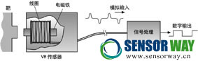 ---- 當(dāng)靶的凸出部分(例如齒輪的輪齒)運(yùn)動(dòng)接近到傳感器,此時(shí)磁通量最大。當(dāng)靶的凸出部分離去,磁通量跌落。靶的運(yùn)動(dòng)結(jié)果引起磁通量隨時(shí)間變化,這在線圈中感應(yīng)出成比例的電壓,以后的電路(信號處理電路)將輸入信號變成數(shù)字波形(脈沖),它能更容易計(jì)數(shù)及時(shí)間控制。