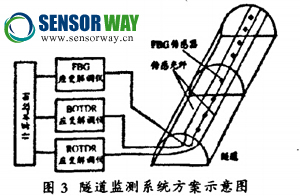 光纖傳感器在隧道上應(yīng)用比較成熟,例如武漢 的天興洲大橋上有成百上千個(gè)光纖傳感測點(diǎn),時(shí)時(shí) 監(jiān)控橋梁的結(jié)構(gòu)、受力和振動(dòng)等情況,一旦發(fā)現(xiàn)異 常,管理機(jī)構(gòu)就能立即采取措施。以某湖底隧道為 例,施工地質(zhì)條件不理想,難度大,尤其是湖區(qū)沙 層分布廣泛,厚度大,對隧道結(jié)構(gòu)采用了分布式 BOTDR光纖檢測系統(tǒng),沿隧道軸向敷設(shè)4根光纖, 其中兩根全面接著(監(jiān)測隧道整體變形),兩根定 點(diǎn)接著(監(jiān)測變形縫和潛在變形處的變形情況)。 通過采用光纖傳感器對隧道進(jìn)行監(jiān)測,實(shí)時(shí)監(jiān)測隧 道變形情況,能夠獲得可靠的數(shù)據(jù),可分析出正確 結(jié)果,反映隧道實(shí)際受力情況,起到隧道的健康監(jiān) 測、預(yù)防保護(hù)作用;能夠體現(xiàn)出光纖光柵傳感器的強(qiáng)大優(yōu)勢,保證了施工的順利進(jìn)行,提升了施工質(zhì)量。光纖傳感器在橋梁隧道監(jiān)測方面的應(yīng)用主要有 以下三個(gè)方面:對采用新型復(fù)合材料的橋梁結(jié)構(gòu)進(jìn) 行監(jiān)測,掌握材料和結(jié)構(gòu)的工作性能;對交通樞紐或具有重大意義的大型橋梁進(jìn)行健康監(jiān)測,掌握橋 梁的正常運(yùn)行狀態(tài);對有一定損傷的舊橋進(jìn)行監(jiān) 測,從而了解其健康狀況并采取針對性的維護(hù)和加固措施。如圖3所示: