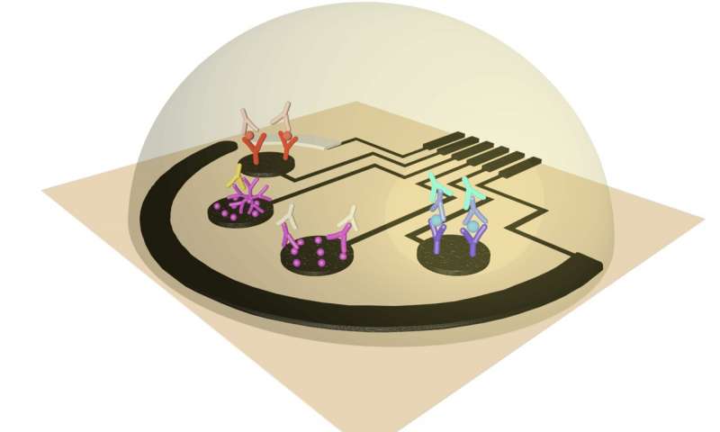 傳感器的早期版本中已浸漬了與壓力有關(guān)的皮質(zhì)醇激素抗體和高濃度引起痛風(fēng)的尿酸。Gao將該傳感器命名為SARS-CoV-2 RapidPlex,它包含抗體和蛋白質(zhì),可以檢測(cè)病毒本身的存在。人體產(chǎn)生的抗病毒抗體;和炎癥的化學(xué)標(biāo)志物,表明COVID-19感染的嚴(yán)重程度。