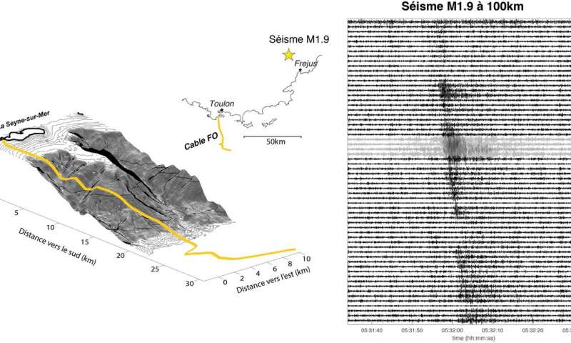 位于弗雷瑞斯(瓦爾)以北的1.9級(jí)地震產(chǎn)生的地震波記錄在沿土倫附近海底部署的41公里長的光纜上。在右側(cè)的記錄中,每條線對(duì)應(yīng)一個(gè)沿著電纜的測量點(diǎn),從海岸(頂部)到大海(底部)。(41公里的電纜相當(dāng)于6000多個(gè)傳感器)。各個(gè)測量點(diǎn)處的波到達(dá)時(shí)間之差用于確定地震的位置。