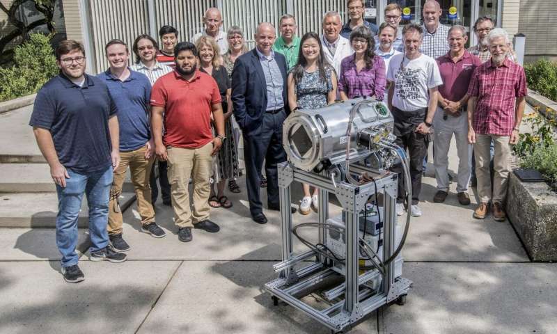Brookhaven Lab的LSST項(xiàng)目團(tuán)隊(duì)的成員將看到一個(gè)原型筏低溫恒溫器。除木筏外,布魯克海文的科學(xué)家還設(shè)計(jì)并制造了低溫恒溫器,可將木筏固定并冷卻至-100攝氏度。圖片來源:布魯克海文國(guó)家實(shí)驗(yàn)室
