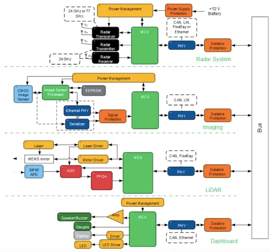 高級(jí)駕駛員輔助系統(tǒng)的示例框圖。圖片由Avnet 提供