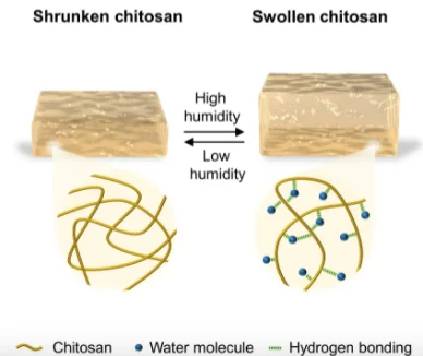 POSTECH 研究人員聲稱,這種殼聚糖(一種可生物降解的聚合物)水凝膠薄膜可以像超級(jí)海綿一樣快速膨脹和收縮:它可以吸收其周圍近 1,000 重量百分比的干重的水分。這種高吸水性質(zhì)量來(lái)自水分子和殼聚糖聚合物之間的氫鍵。