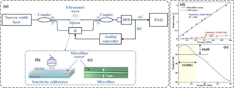 鑒于較大的倏逝場,研究人員將超細(xì)纖維的直徑優(yōu)化為 7μm。如圖1b所示,通過使用具有高彈性光學(xué)系數(shù)的聚二甲基硅氧烷(PDMS)材料來封裝微纖維,進(jìn)一步提高了傳感器的靈敏度。當(dāng)超聲波作用在傳感器上時,由于彈性光學(xué)效應(yīng),PDMS的折射率會發(fā)生相應(yīng)的變化,從而導(dǎo)致微纖維的有效折射率發(fā)生調(diào)制。構(gòu)建了一個馬赫-曾德爾干涉儀來解調(diào)由入射超聲波引起的詢問激光的相位變化. 基于比例積分微分(PID)方法的反饋穩(wěn)定器用于補償由噪聲引起的低頻波動。實驗結(jié)果表明,與標(biāo)準(zhǔn)單模光纖傳感器相比,線性超細(xì)纖維超聲傳感器的靈敏度提高了一個數(shù)量級。該傳感器具有 153Pa 的低噪聲等效壓力和高達(dá) 14MHz (-10dB) 的寬響應(yīng)帶寬。此外,該傳感器可用于微弱信號的檢測,通過優(yōu)化超細(xì)纖維和檢測系統(tǒng),提高傳感器的靈敏度和帶寬。