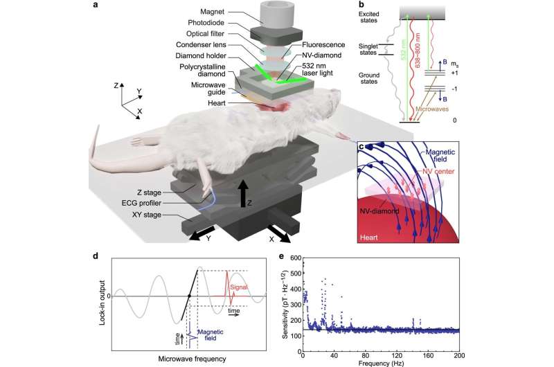 在近期發(fā)表在Communications Physics上的一項研究中,由日本東京工業(yè)大學(xué)(Tokyo Tech)的 Takayuki Iwasaki 副教授領(lǐng)導(dǎo)的一組科學(xué)家現(xiàn)在已經(jīng)開發(fā)出一種新的裝置來執(zhí)行更高分辨率的 MCG。他們的方法基于包含氮空位的金剛石量子傳感器,這些空位充當(dāng)特殊的磁性“核心”,對心臟電流產(chǎn)生的微弱磁場敏感。