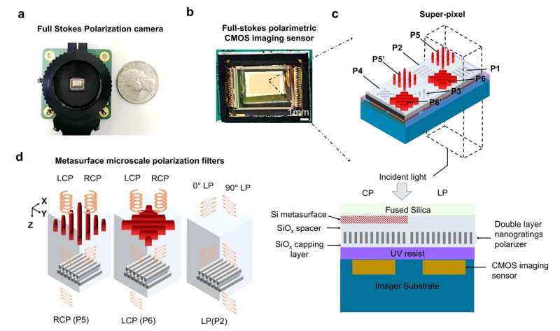 a,全斯托克斯偏振相機的圖像旁邊的一美元硬幣(鏡頭未連接)。b全Stokes偏振CMOS成像傳感器圖像c頂部:芯片集成全Stokes CMOS偏振成像傳感器的3D概念圖。其中P1-P4分別表示傳輸軸為0°、90°、45°、135°的LP濾波器。P5、P5′和P6、P6′分別表示右手圓偏振(RCP)和左手圓偏振(LCP)的手性超表面濾光片。這里P5和P5', P6和P6'在維度上是相同的。下圖為芯片集成偏振成像傳感器二維截面圖。d分別負責(zé)傳輸RCP光和LCP光的一對手性超表面(P5, P6)和LP濾波器(P2)的三維概念圖。致謝:左佳偉、白靜、崔shinhyuk、Ali Basiri、陳夏輝、王超、姚宇