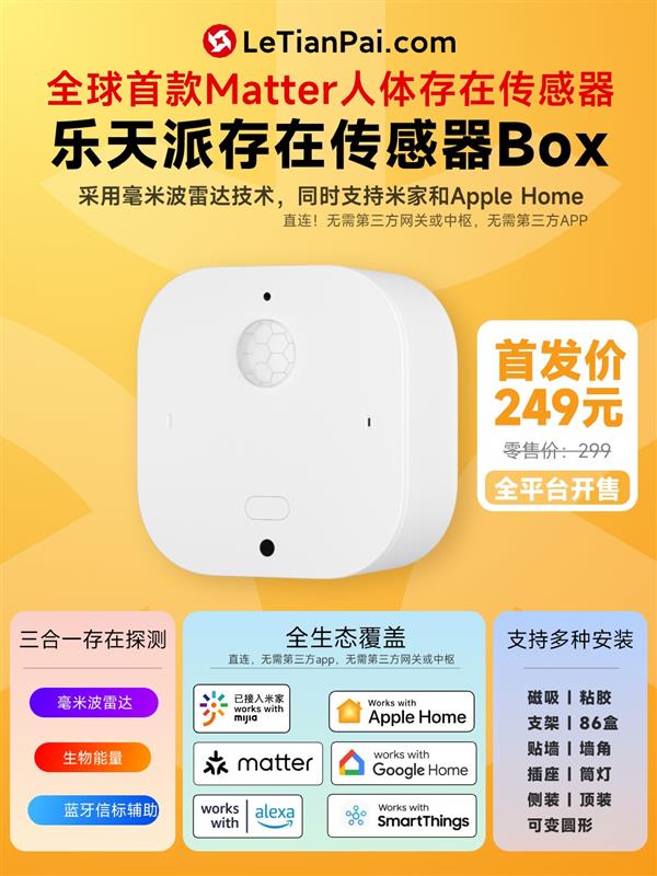 樂(lè)天派公司作為國(guó)內(nèi)Matter智能家居企業(yè),推出了全球首款Matter人體存在傳感器“樂(lè)天派人體存在傳感器Box”,采用毫米波技術(shù),填補(bǔ)了 Matter 人體存在傳感器設(shè)備品類(lèi)的空白,并且同時(shí)支持米家和 Apple Home、Amazon Alexa、Google home等多生態(tài)接入,可以實(shí)現(xiàn)、同時(shí)、實(shí)時(shí)全雙工運(yùn)行,接入無(wú)需第三方網(wǎng)關(guān)和中樞,也無(wú)需第三方APP。