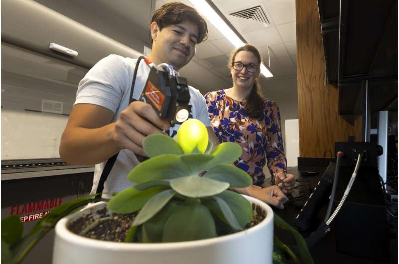 作物、土壤與環(huán)境科學(xué)系碩士研究生馬里奧・索托(左)和農(nóng)業(yè)分部及戴爾・邦珀斯農(nóng)業(yè)、食品與生命科學(xué)學(xué)院精準(zhǔn)農(nóng)業(yè)助理教授奧雷莉・龐塞,展示了一項用于測量除草劑對植物有效性研究的設(shè)備。圖片來源:阿肯色大學(xué)系統(tǒng)農(nóng)業(yè)分部