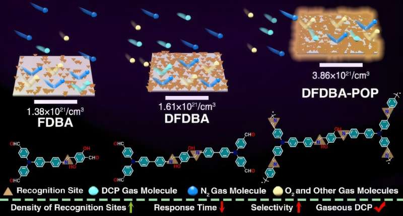 當(dāng) C=N 鍵密度達(dá)到 3.86×1021/cm3 且比表面積為 128.5 m2/g 時(shí),DFDBA-POP 對(duì)目標(biāo)分析物展現(xiàn)出優(yōu)異的傳感性能:對(duì)氣態(tài) DCP 的響應(yīng)時(shí)間僅 1 秒,且在鹽酸等 15 種結(jié)構(gòu)類似干擾物存在時(shí)仍保持高選擇性。此外,團(tuán)隊(duì)通過(guò)制備 DFDBA-POP 固態(tài)傳感器,驗(yàn)證了其對(duì)氣態(tài) DCP 的實(shí)際識(shí)別能力。